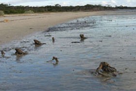 Lang Lang River / drain – source of sediment delta that smothered seagrass and mangrove communities. Photo: T. Ealey WPSP. Increased use of fertilizer and biocides for agriculture and drain vegetation control added to the cocktail of pollutants entering the bay. The first big losses of seagrass in the Lang Lang delta region in 1965-1968 point strongly to catchment discharge effects, particularly smothering sediment loads. However strong and consistent correlations between catchment input episodes and recorded seagrass loss episodes across Western Port have not been proven. There was for many years an active seagrass harvesting industry operating from French Island to supply the insulation market. This industry peaked at the time of the great decline and was based on collection of detritis washed ashore. This activity may have affected seagrass seed reserves but would not impact on seagrass beds. There is some reference to attempted mechanical harvesting, a much more impacting practice, but it is understood such efforts failed to be productive and in any event the natural seasonal leaf shedding process provided ample material for the market. More recent analysis of temperature and low tide conditions by Dr Greg Parry (DPI) has suggested that desiccation of exposed seagrasses at low tide may also have been an important contributing factor. He suggests some seagrass loss episodes have coincided with the temperature increases during the 1982/83 and 1992/93 El Nino years across southern Australia. Linked to the desiccation issue is the height of seagrass beds and whether sediment build up has led to increased periods of low tide exposure and temperature impacts.