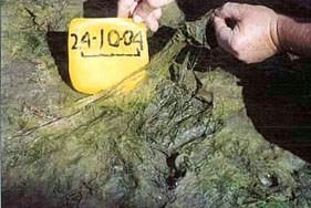 Left: Sunburnt leaves of intertidal Zostera muelleri, but no conclusive evidence of mortality. Photo: T. Ealey WPSP. In 1998 EPA testing of seagrass meadows at various locations in Western Port showed seagrass health was directly linked to water quality, with turbidity and sedimentation being the key factors as these directly impacted on the capacity of these plants to photosynthesize. International studies have also shown that elevated nutrient levels in marine waters are linked with excessive algal growth on seagrass leaves (epiphytes) which significantly hinder photosythesis. So for seagrasses, sediments and nutrients are key pollutants. One thing is certain, as the seagrass meadows declined, increasingly large areas of bare mudflats were subjected to tidal erosion, with daily re-suspension of fine sediments, which in itself reduced water quality and the viability of remaining seagrass meadows. This problem still exists, and without a sediment budget (net loss or gain of sediments entering and leaving the bay), it is unclear if and when natural tidal processes will ameliorate the problem. |