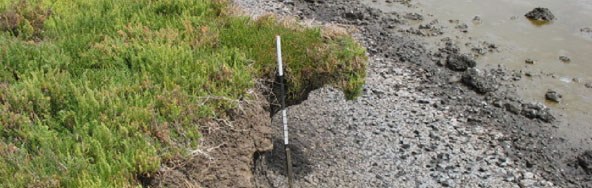 Saltmarsh being eroded away along northern coastline of Western Port due to absence of mangroves. Photo: T. Ealey WPSP.