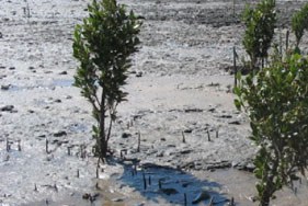 Left: Young mangroves showing cable roots radiating from base. Photo: T. Ealey WPSP.