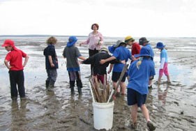 Bass Valley Primary School teacher Tina Mayling takes her class onto the mudflats to plant the mangroves. Photo: T.Ealey WPSP