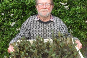 Dr Mangrove (Tim Ealey) holds a tray of mangrove seedlings grown by the children at Bass Valley Primary School.